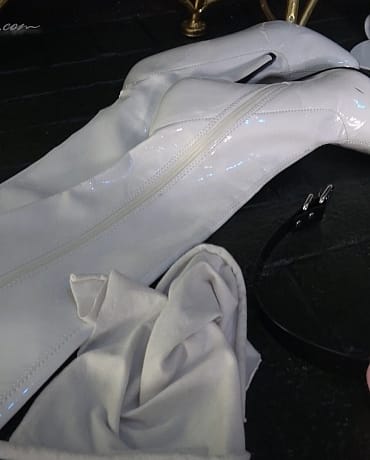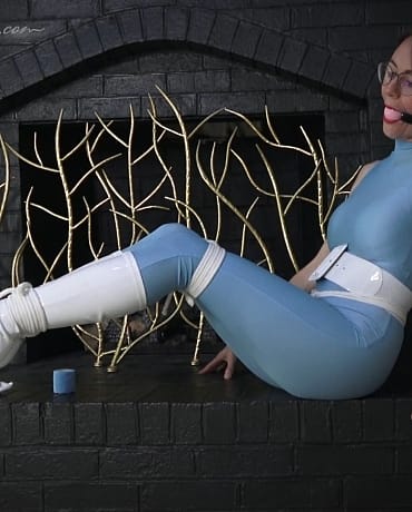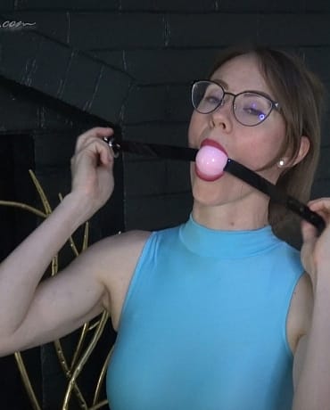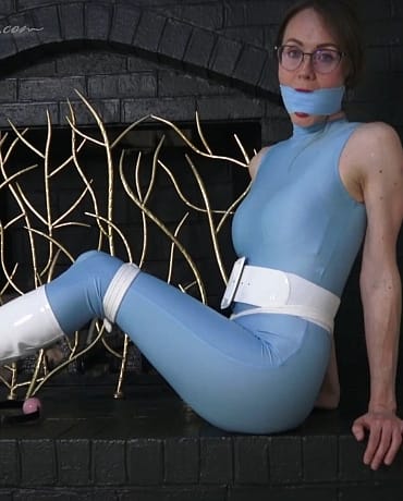 Madalynn is wearing a light blue tight spandex bodysuit, and puts on her thick white belt and patent knee high white boots after she gags herself with a light pink ball gag. She rubs her hands all over the slick tight fabric and teases you with those eyes of hers while trying to articulate through the ballgag.