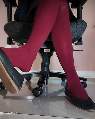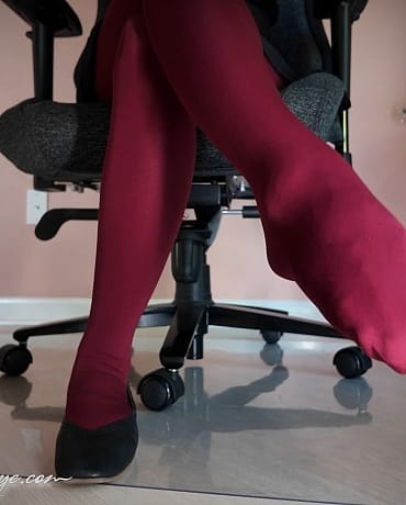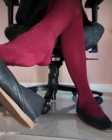 Madalynn has on a pair of thick dark red tights on for this edition of “Come Under My Desk”, she’s sporting a short pleated skirt, and black leather ballet flats that she dangles and drops.