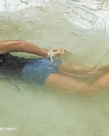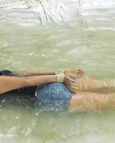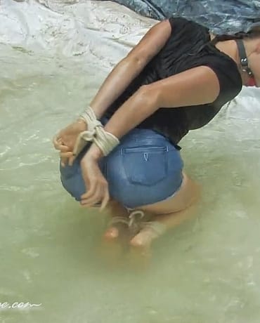 My wrists and ankles are bound and a red gag ball is strapped in place and I'm stuck in the water hole! Luckily, the ties are just within reach and I'm able to pull them loose to escape!