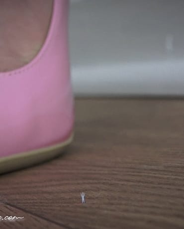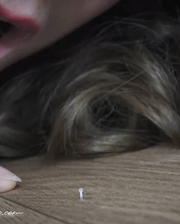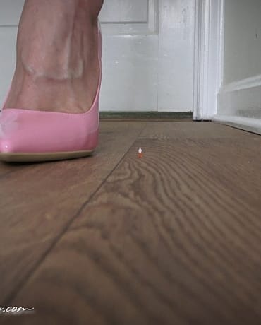 By the time the blue light has dissipated, she doesn’t even see him. She didn’t anticipate the ray would make him even SMALLER! Madalynn finally finds him and cannot believe just HOW much smaller he became. She measures the tiny man up against her high heel, and begins stomping around and asking how the ground feels. “Better watch out! Because I’m going to get you!”, she continues to stomp around.