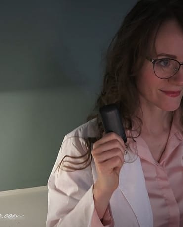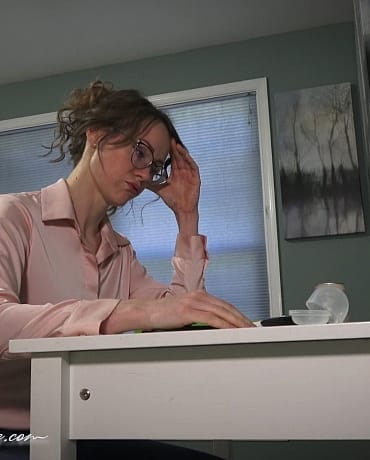 Madalynn addresses her need for a break and props her one barefoot and one ballet flat covered foot up on the desk. She dangles the ballet flat and asks if being this close to her feet is still sexy, or terrifying? “I bet the wind from me dangling my ballet flat must be insane!”