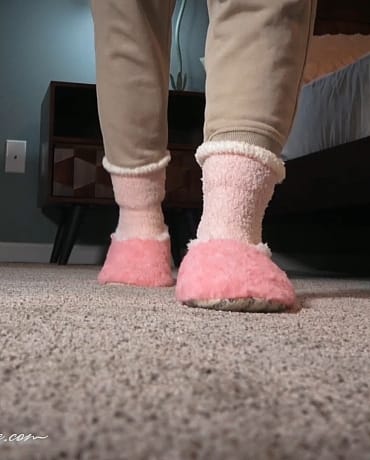 After a few seconds of moving her foot back and forth, making sure the job is done, she puts her fuzzy socks and slippers back on and leaves the living room.