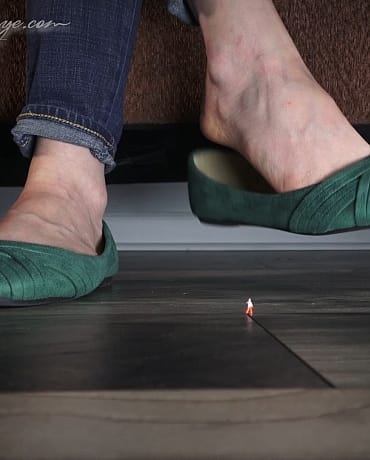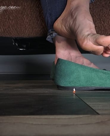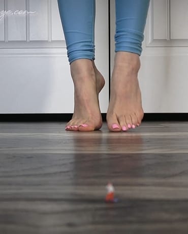 She places the leather ballet dance slippers on her feet and does a series of warm up exercises before the music comes on and she prances around. Unbeknownst to her, her tiny assistant hitched a ride and is on the dance floor. Madalynn has no idea as she moves around to the rhythm that she’s putting him in such danger. The inevitable happens and he gets pushed into the bottoms of her leather slippers and stuck there for the rest of her movement exercise.