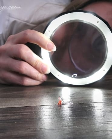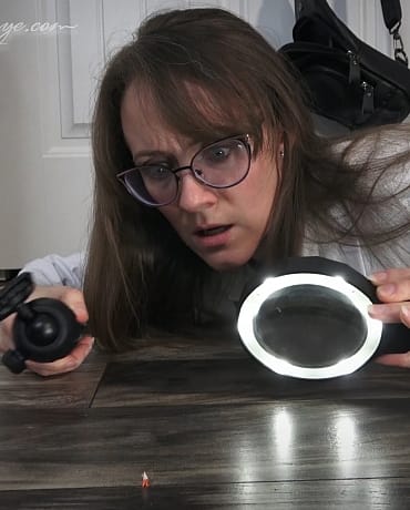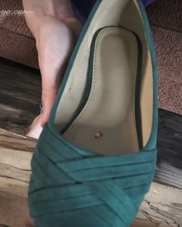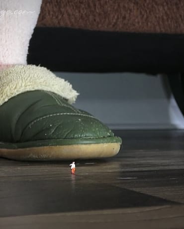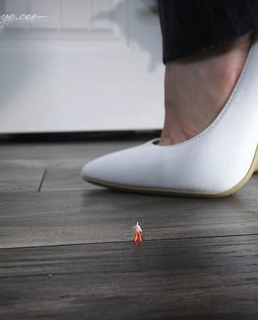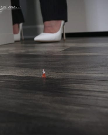 Madalynn begins to dangle her shoe and has no idea that her assistant is RIGHT THERE under her foot trying to get her attention. He watches as the shoe dangles back and forth until it drops right next to him with a huge THUD. She feels around with her foot, for the shoe, while focusing on her work and accidentally steps right on the microscopic lab assistant! Sticking to the bottom of her sole, he’s lifted high and then she puts her shoe back on.
