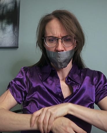 Her hands are tied in front of her this time and she has a thick panty gag, numerous strips of duct tape over her mouth and an over the nose face scarf is in place. Madalynn is FUMING MAD! So had she gag talks so hard her glasses start to fog.
