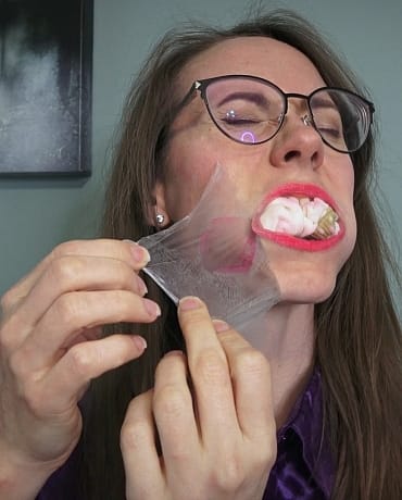 She gets her hands free and removes the tape slowly from her face and cries about how she’s going to need her make redone. She drops the socks after making an empty promise and tells the guy that he’s still mistaken. The guy says he’s going to regag and bind her again, Madalynn chastises him dramatically before she goes on a monologue.