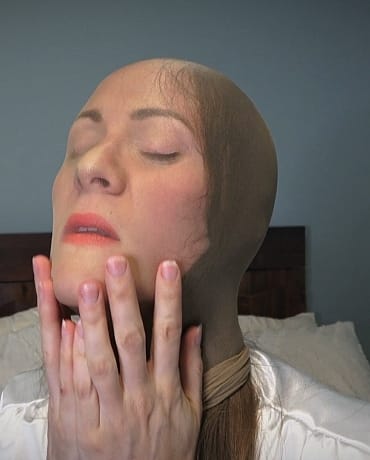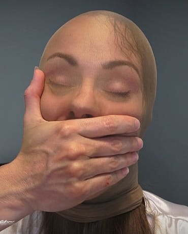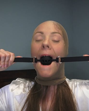 Hot and horny Madalynn hops on to the bed and kicks off her black ballet flats, presenting you with her sheer, shiny pantyhose feet. She leans back and shows you her shiny legs and you almost get a glimpse up her skirt. Her white pedicure popping through the nylon. She winds you up and gets her pantyhose hood out and puts it overtop of her head while teasing you with her pantyhose feet and starts hand gagging and talking through it. Madalynn knows how much you love gag talk and nylon hoods over her head. After bit more teasing with her over the mouth hand gagging, she pulls out a ballgag and wedges it deep between her lips and tightens it as far as it can go. She’s hooded, gagged and wiggling her pantyhose soles at you while drooling and telling you how hot this makes her!