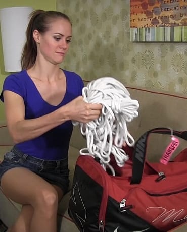 **this clip is from 2013, remastered in 2025** Madalynn is waiting for Steve to give her a ride somewhere. While she waits, he puts a duffel bag on the sofa and asks her not to look inside. This gets Madalynn curious and she decides to look anyway. She is puzzled when she finds lots of rope and a couple of other items she cannot explain. Suddenly, the man returns and catches her looking in the bag. "I thought I told you not to look in the bag!" he tells her. "What do you use all this rope for!" Madalynn asks him. When he tells, her it is for a game he and his girlfriend plan to play tonight, Madalynn figures out that he plans to use the rope to tie up his girlfriend for some kind of kinky sex game. Madalynn immediately decides that she wants to be tied up and begs the man to cancel his date so he can tie her up instead. So, after talking him into it, she finds herself all tied up with rope. Then she finds out there is more to bondage than just tight rope when the man shoves a huge rubber ball in her mouth and buckles it tight. Madalynn panics and tries to tell the man that she doesn't want to play anymore. But all she manages to get out are a few muffled grunts and a whole lot of drool. After watching her struggle bound and gagged for a bit, the man removes the ball gag. But before Madalynn can say very much, he stuffs her mouth with a large pair of panties and tapes her up to gag her again. As Madalynn rolls around on the sofa, her skirt rises above her hips to show her red panties under her sheer to the waist pantyhose. It is about this time that she realizes that maybe she is in a little bit over her head and being so nosy might have been a mistake. But she soon finds out that the night is just starting as she sees the man call his girlfriend to cancel their date. Then things get really bad when he puts Madalynn in a very tight and strict hogtie.