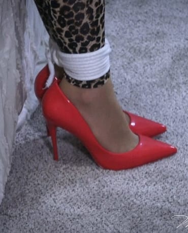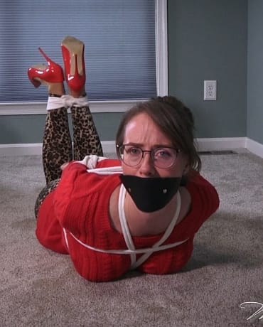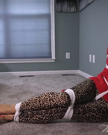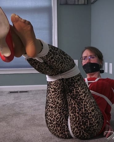 MILF Madalynn is all over the floor and kicks off her stilettos, showing off soft, sheer pantyhose covered feet that she flexes as she tries to loosen the ankle ropes!