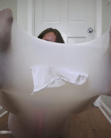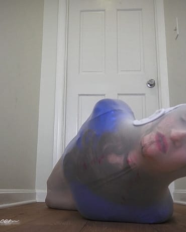 She’s far too cocky in just the rope, and that could be dangerous; so the villain cocoons her in a white nylon sack. She struggles, writhes, gloats, and tells the villain they’re no going to get away with this! But it seems the more she struggles, the tighter the casing becomes. She pushes with her hands and feet but it just wont budge!