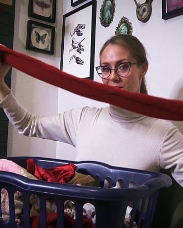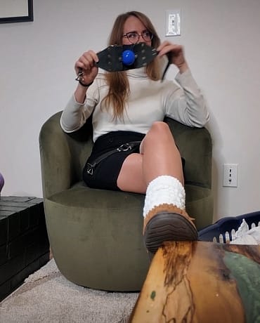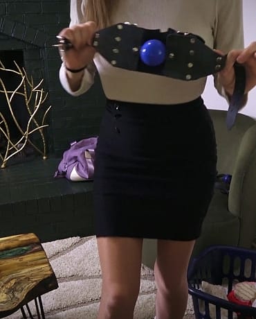When she comes back and notices you haven’t found anything, she gets a sly look on her face and decides to take control of the situation. She pulls out a laundry hamper FULL of socks and panties from the side of the couch. Showing them off to you before she pulls out a gag and makes the executive decision that it’s for you.