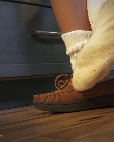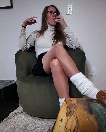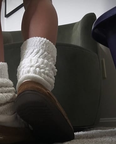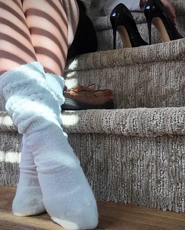 Your kinky little boss has invited you back to her place after a long day of work, she walks past you to the stairs, and takes a seat. You notice her slippers and a very dirty pair of slouch socks are waiting there and you stir a little bit. God, you just LOVE her big, thick slouch socks! She removes her high heels, slides on the socks; scrunching them in just the right ways and puts on her house slippers.