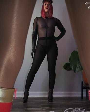 In her not-so-secret hide out tending to her plant, BlackCat clad in her signature mesh catsuit, leather gloves, and sky high black heels is prancing around wiping leaves and admiring her beauty when UltraGirl lands behind BlackCat. UltraGirl confronts BlackCat about her plans to take out the grid but BlackCat has more news up her sleeve, she tells UltraGirl that she’s going to take down a few hospitals while she’s at it. Determined to save the day UltraGirl reluctantly hands over her power belt and allows the BlackCat to bind her… When we come back, UltraGirl is bound from chest to ankles, numerous lengths of rope covering her thick pantyhose covered legs, and over her shiny lycra leotard and red short-shorts. She’s squirming and struggling, when BlackCat comes back over to tease and taunt her about how helpless she is. BlackCat has heard enough from UltraGirl and gags her with a long length of microfoam wound around her head. Confident in her bondage and gagging of UltraGirl, BlackCat strolls off to do what supervillains do best. Struggling with all of her might, UltraGirl manages to inch closer to her power belt that BlackCat carelessly left behind. Soon, the golden belt is in UltraGirl’s hand and she’s powering up to full strength! The gag and ropes are on the floor, UltraGirl is zipping up her boot and ready to track down BlackCat. Entering the room with the tip-tap of her black high heels and shocked to see the pile of rope right where UltraGirl was, BlackCat looks around bewildered before UItraGirl steps back into the frame and you can see the fear of BlackCat from a view behind and between UltraGirl’s nylon and boot clad legs.